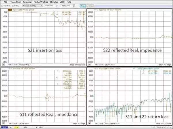圖4是矢量網(wǎng)絡(luò)分析儀測量的頻域和時域的結(jié)果圖。圖右下角的回波損耗(S11和S22)的兩個標記分別表示了不同頻率下的回波損耗值。標記2位于40.7GHz處,是該測試電路具有良好回波損耗的最高頻率。反射波S22的阻抗顯示在圖右上角,反射波S11的阻抗顯示在圖左下角。如S11的標記所示,在通孔轉(zhuǎn)換中的阻抗值,標記1,2和3,電路具有大約48?的阻抗。在通孔過渡區(qū)域中可觀測到較小的阻抗變化,阻抗變化小于2?,對電路的RF性能幾乎沒有影響。從這些測試結(jié)果,電路可被認為從頂層到底層信號具有的良好的通孔過渡,同時,它還具有到40GHz的良好插入損耗性能(如圖左上角所示)。
