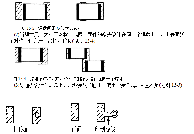 (2)焊盤(pán)間足L—確保元件端頭或引腳與焊盤(pán)哈當(dāng)?shù)拇罱映叽纭:副P(pán)間距過(guò)大或過(guò)小都會(huì)引起焊接缺陷;(見(jiàn)圖15—1)。