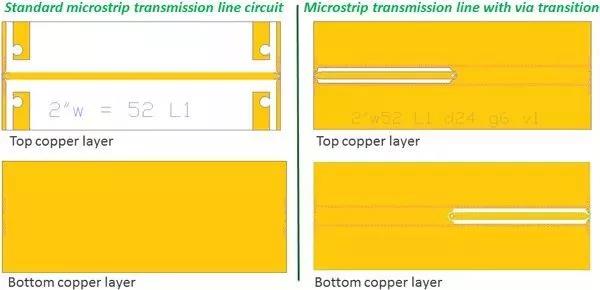 圖3. 這些電路是用于評估金屬化過孔孔壁表面粗糙度對高頻下RF性能的影響的電路設(shè)計,左圖是標準的微帶傳輸線,右邊是具有金屬化過孔的微帶線電路。