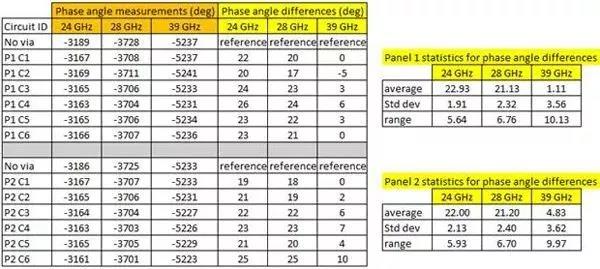 圖5中的電路ID可以顯示電路來自哪個12×18英寸的大板,以及該板上的電路ID編號。例如,P1 C4來自板1,電路編號為4號。電路彼此之間互相遠離并均勻地分別在12×18英寸的板上,以保持一致性。某些變化是可以事先預(yù)料到的,因為它們對相位角的差異非常敏感。某些變化是由于PCB制造過程而造成的,而不是金屬化過孔壁粗糙度的原因,包括導(dǎo)體寬度的變化,鍍銅厚度的變化和鉆孔質(zhì)量的變化。此外,金屬化過孔周圍的縫隙由于PCB的正常制造公差也會出現(xiàn)一些變化。同樣,每個板上的微小材料變化,如Dk值的微小變化,也可能導(dǎo)致相位的變化??紤]到圖5所示的測試值,在39 GHz時相位數(shù)據(jù)的可重復(fù)性標準差小于±1.2度,這是非常好的。